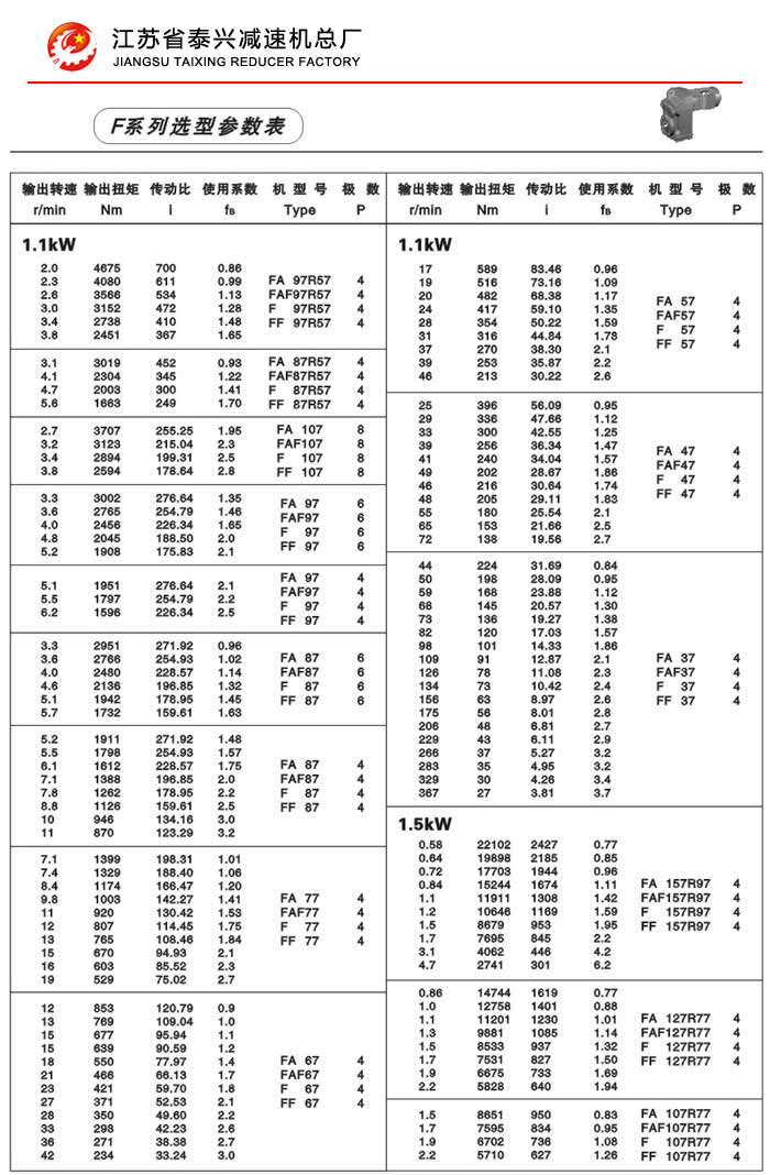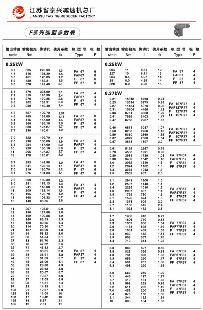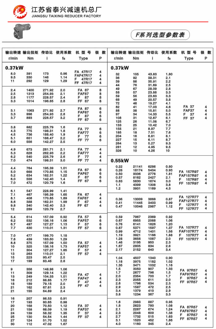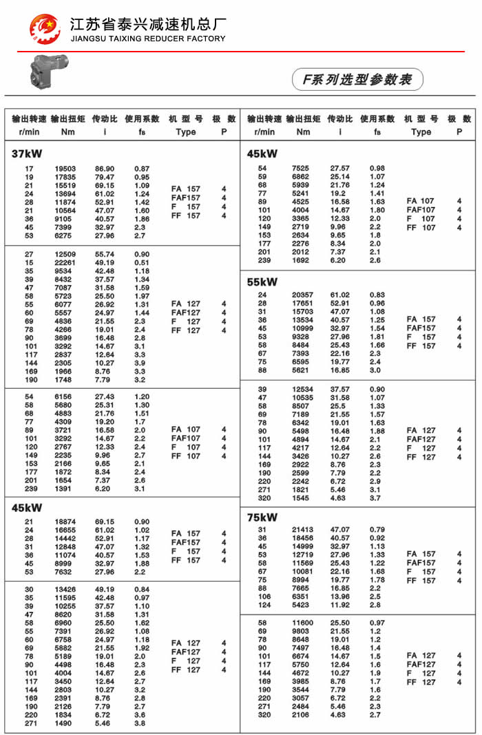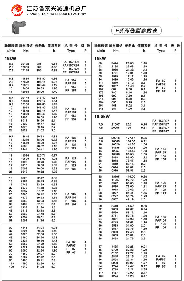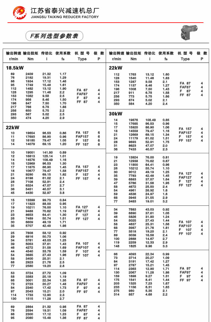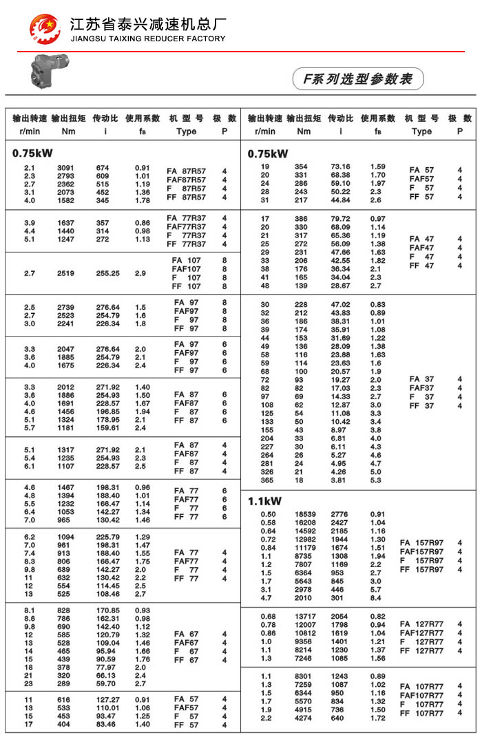 F系列平行轴斜齿轮减速机性能特点: F系列平行轴斜齿轮减速机具有体积小、重量轻、传递扭矩大、起动平稳、低损耗、安装方式多样,输入输出灵活等特点。非常适合在空间受限制的情况下使用。并能与各种减、变速机组合,适用于各种不同条件要求的场所。 技术参数: 安装形式: 电机功率:0.18~200Kw 底脚安装 输出转速:0.1~752r/min 法兰安装 输出转矩:高至17000Nm 轴装安装