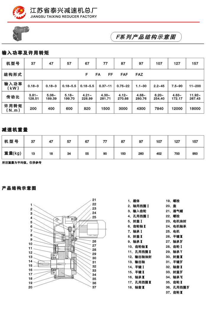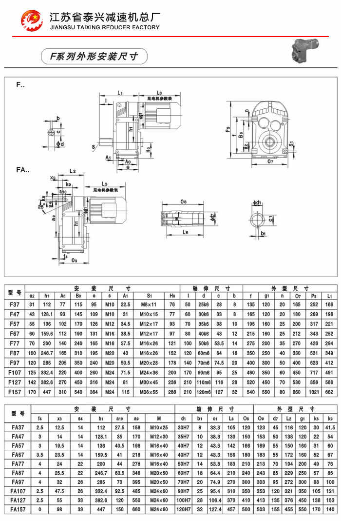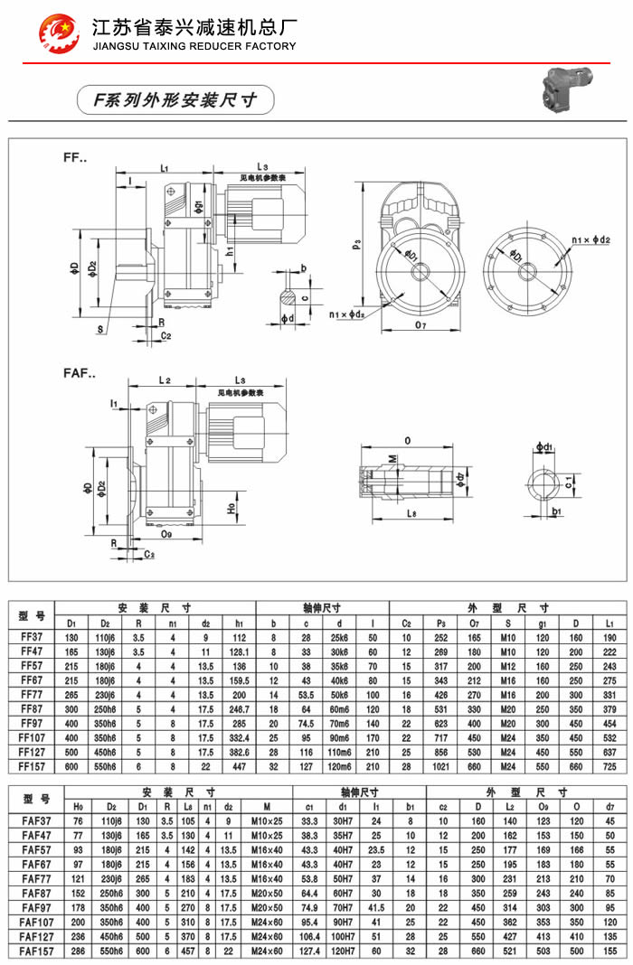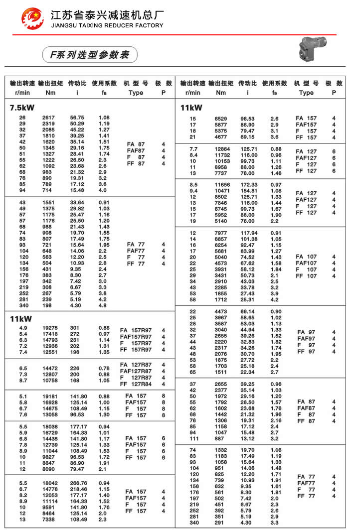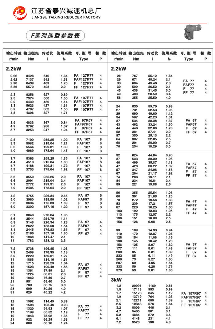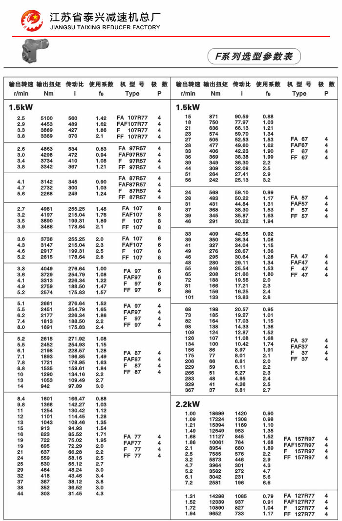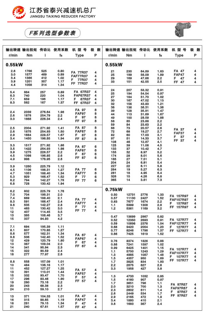 F系列平行轴斜齿轮减速机性能特点: F系列平行轴斜齿轮减速机具有体积小、重量轻、传递扭矩大、起动平稳、低损耗、安装方式多样,输入输出灵活等特点。非常适合在空间受限制的情况下使用。并能与各种减、变速机组合,适用于各种不同条件要求的场所。 技术参数: 安装形式: 电机功率:0.18~200Kw 底脚安装 输出转速:0.1~752r/min 法兰安装 输出转矩:高至17000Nm 轴装安装