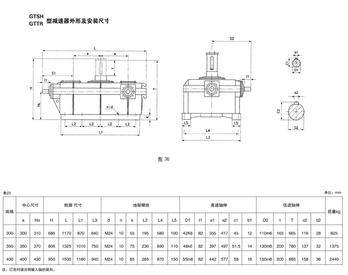 GTTR三环减速机为组合二级传动,为钢包回转台用,具有两根垂直于平面的高速轴,箱体平置,装端面剖分,此减速机中心距范围300-400mm,速比77.9-503.3,输出转矩范围10.52-24.67kN.m。