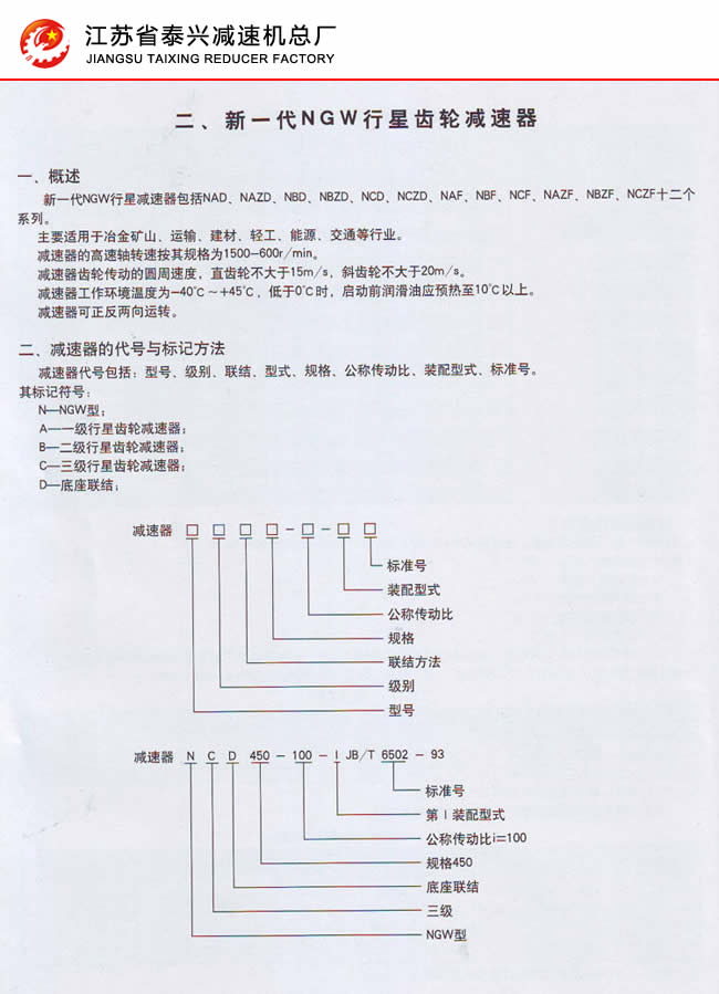 一、概述 新式NGW行星减速器包括NAD、NAZD、NBD、NBZD、NCD、NCZD、NAF、NBF、NCF、NAZF、NBZF、NCZF十二千系列。 主要适用于冶金矿山、运输、建材、轻工、能源、交通等行业。 减速器的高速轴转速按其规格为1500-600r/min。 减速器齿轮传动的圆周速度,直齿轮不大于15m/s,斜齿鸵不大于20m/s。 减速器工作环境温度为-40℃-+45℃,低于0时℃,启动前润滑油应预热至10℃以上。 减速器可正反两向运转。