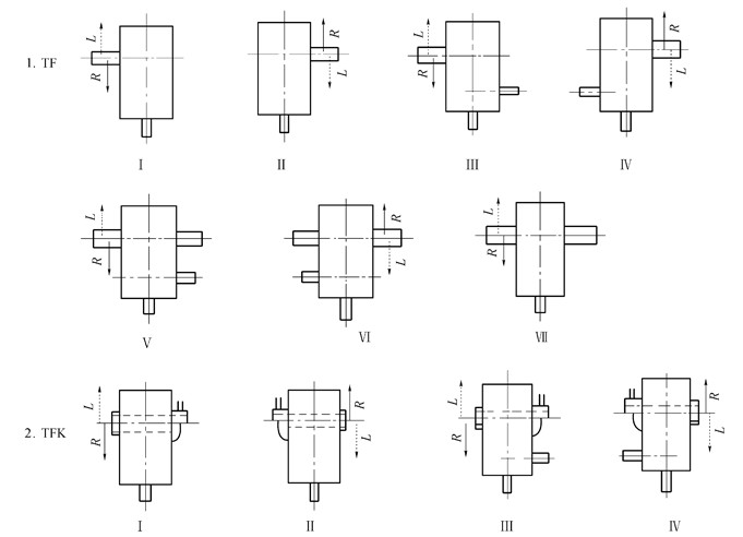 按输出轴分,TF可分为Ⅰ、Ⅱ、Ⅲ、Ⅳ、Ⅴ、Ⅵ、Ⅶ七种装配型式,TFK可分为Ⅰ、Ⅱ、Ⅲ、Ⅳ四种装配型式。如需配逆止器时请注明(一盘为自配),